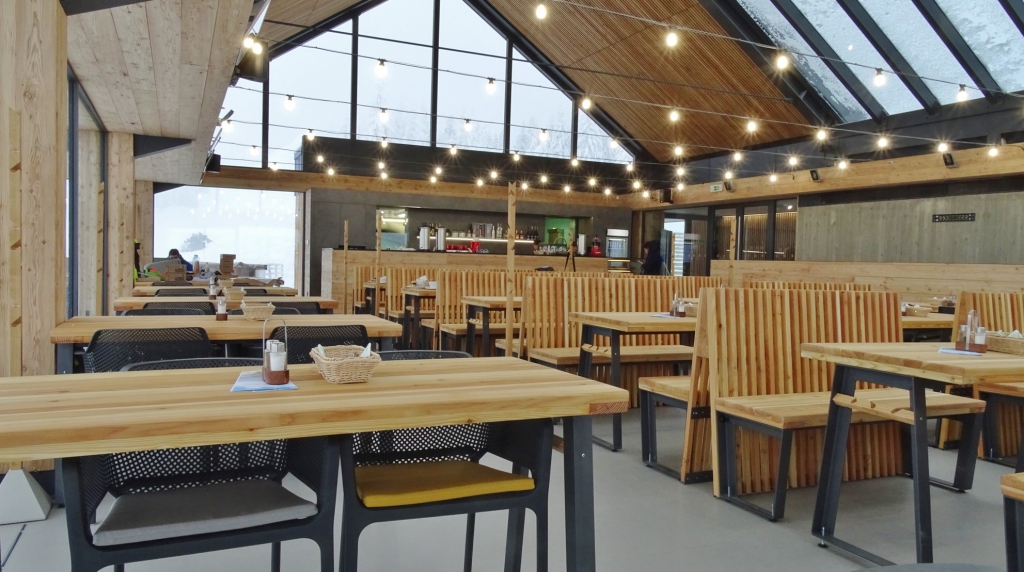 Obsluhovaná restaurace s moderními lehkými a svěžími jídly, kterou najdete přímo u Stezky v oblacích na křižovatce sjezdovky A a sjezdovky Vyhlídková.